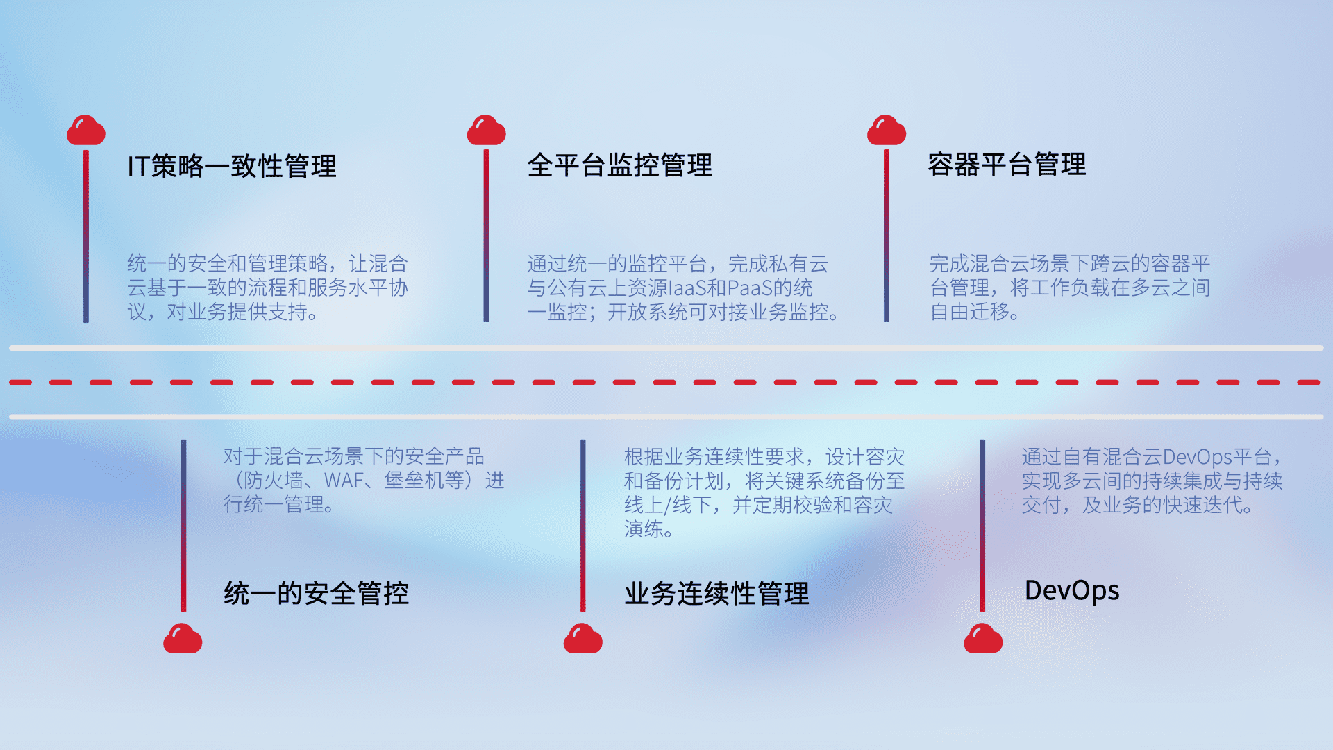 通过多云纳管,,以统一的资源数据模型把客户的云资源进行抽象和封装,,,进而实现对多云资源的统一操作,,保障云资源管理的可靠性、、、稳定性与可用性。。。。量身定制化运维内容,,配置、、、开发运维、、、、补丁管理、、、备份、、、、监控、、、、认证和访问管理、、审计和日常巡检等,,,保障在用云过程中的可靠度,,,稳定度以及高可用率。。