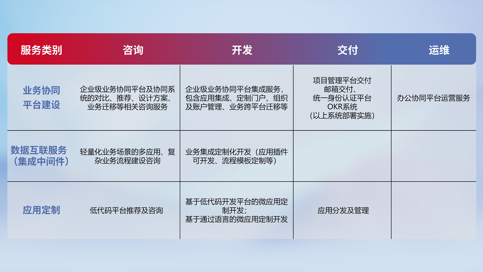 针对钉钉、、、、企微、、IDaas等平台级产品提供产品的规划、、、、方案、、交付、、、、定制化开发等服务,,,实现如统一协同办公、、、、智能客户服务、、混合会议管理、、、、智能数据查询、、等业务场景,,实现数字化转型。。